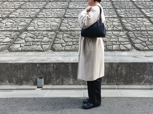 ただし、マチが広いので、中に荷物を入れ過ぎるとボリュームが出てしまい、コートの上からの肩掛けはちょっと窮屈です。