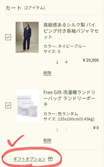 ギフト設定をするには、カート内で「ギフトオプション」にチェックを入れてください。