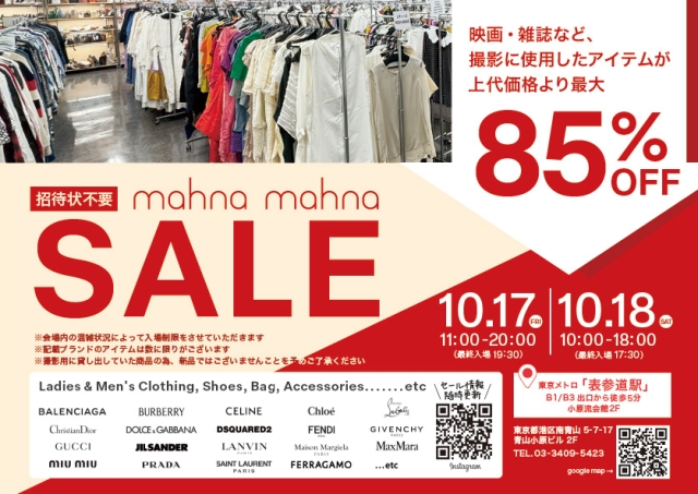 マナマナ公式サイト⇒お知らせ「10月17日(金)、18日(土) mahna mahnaファミリーセールを開催いたします」