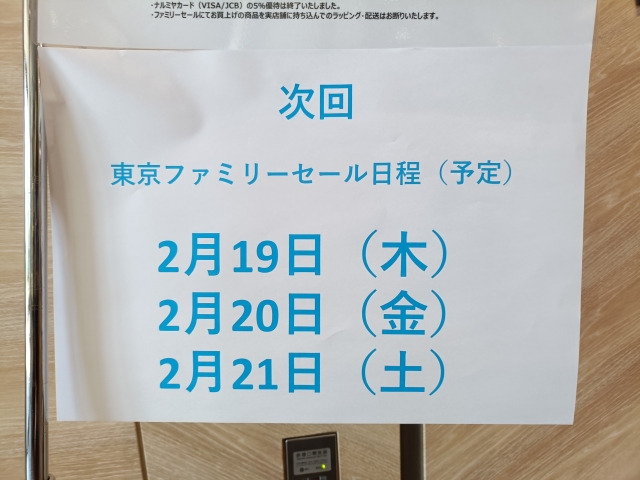 ナルミヤファミリーセール東京会場の次回開催予定は2026年2月19日(木)、20日(金)、21日(土)の3日間です。